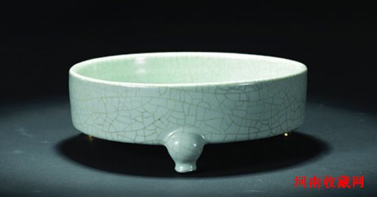 “内府所藏柴汝官哥钧定”通过这条文献记载,奠定了汝窑作为宋代五大名窑之首的至尊地位。这件奁式洗,是雍正官窑仿汝釉作品中的成功范例。洗圆口,直腹,平底,下承三只简意兽头足。胎骨呈香灰色,通体内外施青釉,肥厚温润,色泽界于天青与月白之间。温润的釉面上又布满细密天成的纹片。外底上有九个芝麻点组成的支钉装烧痕迹圈,中心署“大清雍正年制”六字三行青花篆书款。