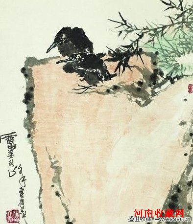 潘天寿的指墨画《竹石双栖》是其一贯的对比式画风,大面积的石块上两只乌鸦栖息其上,石势危重,以浓重的笔墨画鸟,压住画面不使空荡失势,旁有野竹数箭,增强画面的丰富性和空间感,画家的手段在不露声色中令人叫绝。人物画《寂禅》画一老僧冥思,是他早年的作品,而其对空间和人物神态的描绘已见成熟期的消息。而《花荫憩鸟图》则是潘氏作品中少见的唯美作品,绘花荫之下独鸟栖憩,安静祥和之态跃然纸上,此作为寿崇德先生旧藏,多见著录。此外,《寂鸟图》为星洲大藏家黄曼士所藏,徐悲鸿亲为题签,亦是不可错过的佳作。