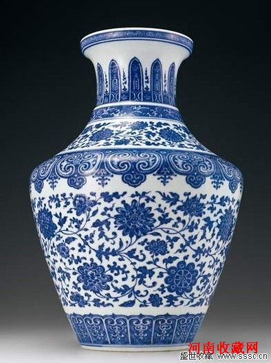 此件精美端庄的青花盘口尊,以上古时代的青铜器“尊”作为原型,属于乾隆时期青花瓷器隽永之品,整体造型典雅优美,其盘口粗颈,斜肩微折,腹部自肩至足渐敛,用简约的线条勾勒出了端庄秀丽的倩影,矮足内卧,底白釉,中央书青花“大清乾隆年制”六字篆书款。此器满绘青花纹饰,主体纹饰为缠枝莲纹,其布局疏密有致,活泼婉转,毫无拘泥拖沓之感,小而细碎的卷草纹,衬托于莲花与牡丹之间,其流转间精到的笔触与自然活泼的意蕴完美融合,配以柔和悦目的青色,可以使人深切感受到乾隆皇帝对于永宣青花艺术成就的欣赏与礼赞,瓶口外沿装饰的勾莲如意云纹,颈部装饰的蕉叶纹,颈下饰的海涛纹,以及肩、颈间饰缠枝莲纹、折肩处饰如意云纹、胫部饰莲瓣纹,使得瓷尊通体共有八层纹饰,釉面细腻光泽的玻璃质感,更衬托了构图的精致,器形的别致。