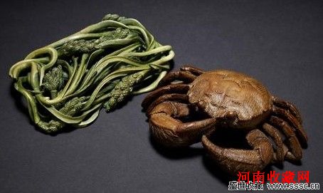 清乾隆 竹雕螃蟹和牙雕染色水草底座