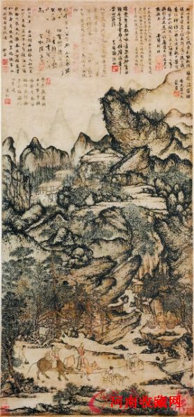 《稚川移居图》画的是东晋葛洪移居罗浮山炼丹的故事。画上有与王蒙同时或稍后的七位大学者、大画家或大诗人如韩性、倪瓒、陶复初、陈则等人的题诗。韩性是元代另一位大画家王冕的老师,他的题诗笔法与美国克利夫兰博物馆收藏的《竹石幽兰》的题诗如出一辙;“元四家”的另一位代表人物倪瓒的题诗也与他公认的转世画作《松亭山色》及《容膝斋图》非常一致;而与高启等人并称为“十才子”的陈则的题诗是他存世唯一的书迹,本身就具有极高的史料价值。此外,《稚川移居图》上还有明代大收藏家项元汴近20余枚收藏印,极为珍罕难得。当代中国书画鉴定大家傅熹年先生高度赞扬此画,上海博物馆研究员、中国古代书画鉴定专家钟银兰先生也认为此件甚至比北京故宫所藏王蒙同题材作品更为精妙。