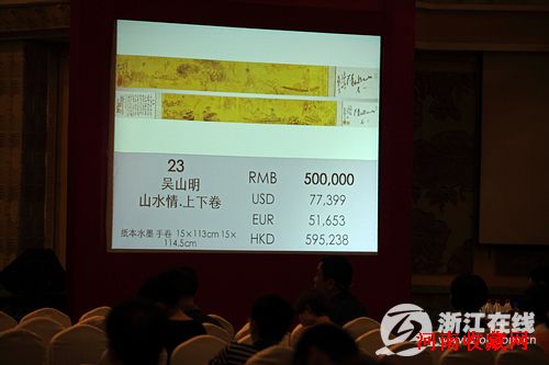 这部作品是1988年吴山明应上海美术电影厂厂长特伟约请,特聘为水墨动画《山水情·上下卷》的人物造型与山水总设计。不过原件已不可寻,这幅作品是中国美术学院教授吴山明重新创造的一幅水墨动画。《山水情》这部动画片曾获得《蒙特利尔国际电影节短片大奖》,这是中国水墨山水动画片迄今最后一部在国际上获奖的作品。经过一番激烈的争夺,最后这幅画以56万元成交(落槌价和成交价不同,成交价需要在落槌价基础上乘以1.12倍的佣金),这也成为昨日拍卖会的标王。