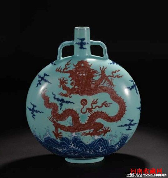乾隆官窑松绿石地青花釉里红云龙纹抱月瓶