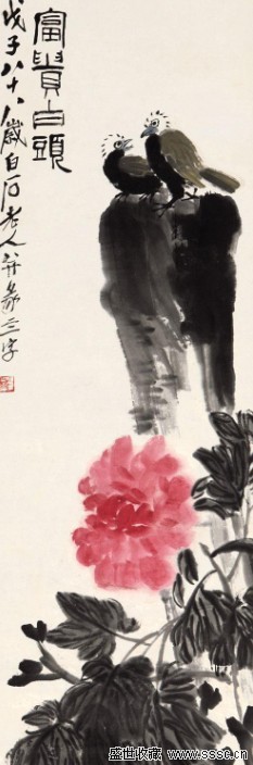 情趣是生命的表现,生命的欢乐方式。能表现生命情趣的画家是富于爱心、敏于生命欢乐的人。历代画家中能像齐白石这样善于刻画生命情趣的,实不多见。是幅《富贵白头》作于白石老人八十八岁,正是其艺术生涯的顶峰。经过了“衰年变法”后的白石老人以其独特的大写意国画风格,开红花墨叶一派,名重一时。画中象征富贵的硕大牡丹极为抢眼,用笔毫不迟疑、结构清晰,色与水的比例调和几入化境,使牡丹艳而不俗。两只活泼可爱的白头鸟立于石上,神采奕奕,一只昂头卷舌,一只似在倾听,活灵活现、生趣盎然。白石老人对石头及花叶细微之处的处理也同样一丝不苟,笔笔谨守法度,叶脉清晰、墨气淋漓。整幅作品寓意吉祥、色调明快、趣味十足,实为难得之佳构。老人那农民的天性使他的画作永远都是从生活中来,经过其多年的观察、研究、积累、提炼,始达到“似与不似之间”——即放弃形似,超越对表面形似的模拟而达到形神兼备的最高境界。真大师也。