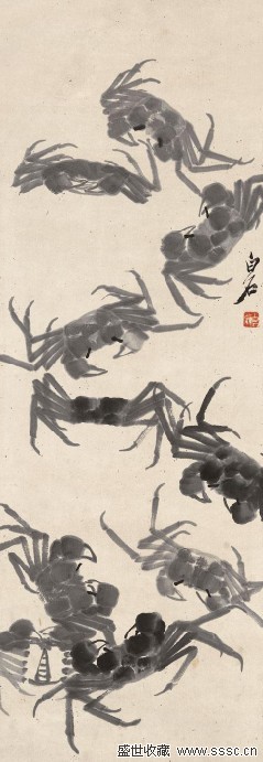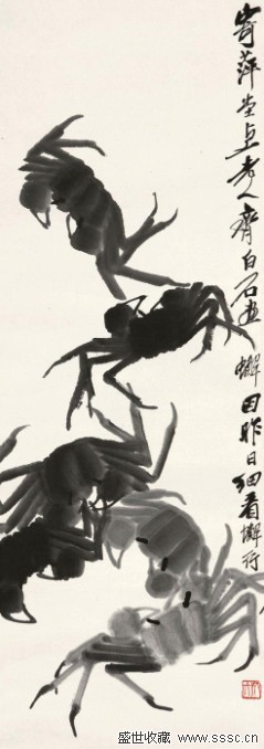 本幅作品为夏午诒旧藏,应为齐白石倾心之作。齐白石曾把一些虾蟹养在玻璃缸中,细心揣摩,入微观察,尤其是在水中的动态。所以画起来得心应手,挥毫而就。随着水墨浓淡层次的不同,使甲壳的感觉洗练生动,突出其质感和体积感。且尤其是画蟹腿,下笔有力,老辣畅快,节与节间笔断意联,墨水晕开,有腿上细毛之感觉,形神俱备,颇有“墨气淋漓障尤湿”之感。