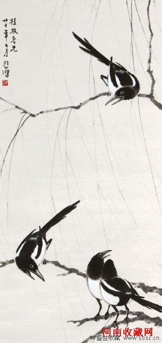 徐悲鸿是近现代画家中将中西绘画艺术融会贯通的代表人物之一,他的花鸟画既注重西洋画派的造型感和技法,也继承了中国传统文人讲究“以形写神,意在画外”的精髓。而喜鹊是徐悲鸿经常描绘的题材,他在一生中也画了许多以喜鹊为题材的作品。本幅作品构图巧妙,以纵线的柳枝为基本语言,柳丝弄碧,交错垂下,线条潇洒舒畅,似静实动。而四只喜鹊相互交错、层次分明、神态各异且生机勃勃,令观者有春意盎然的喜悦之情,充分体现了大师扎实的写生功力和卓越的造型及构图能力。