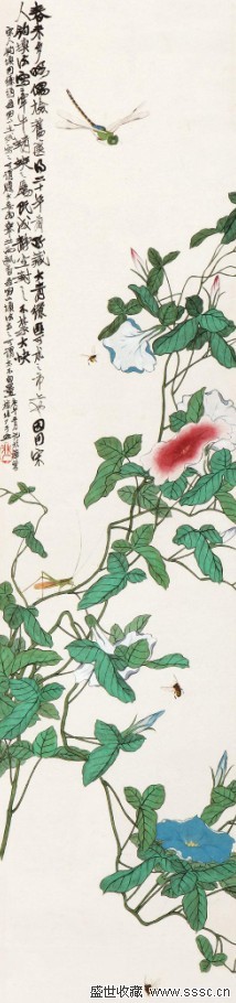 本幅作品创作于1930年初,这一年正是于非闇从早年师宗白阳、青藤的写意花鸟向工笔重彩的过渡时期。因此从画面题款书风来看,尚未形成他后期惯用的“瘦金体”书风,这种略带元人风格的行楷书体在其后来的工笔画作中极少用到。于非闇的工笔花鸟从明代陈洪绶双钩着色入手,远溯宋元,尤得宋院体画精华。本幅作品亦是如此。“他勤心而虚心,每一张画都是他精心设计、精心构思、到处写生、到处征求意见而成的,每一张都有一小部分的创造史。”(胡絜青《想起了于非闇大师》)题跋中于非闇自嘲“胆大妄为”、“太不自量”,实为其研习探索精神之反映,舍惯性手法而挑艰难途径行之。花朵娇艳丰茂,设色淡雅、笔墨清秀洒脱。于非闇自幼就喜养鸟种花,喂养昆虫,平时经常到公园写生名花珍禽,体验所画对象的形神。画作中的蜻蜓、蚱蜢、蜜蜂皆从写生而来,将传统艺术的精华与师法自然相结合,抓住物象的重点去表现,造型准确,细致精微又生动传神。清丽秀雅的花朵、展翅于花上的蜻蜓、飞舞于花间的蜜蜂、静卧于藤蔓蚱蜢,动静结合,整个画面赏心悦目,宁静而雅致,极具文人情怀,实为于非闇早期工笔草虫的精品。