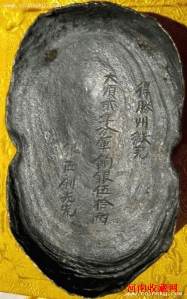 明代万历五十两饷银银锭,为明末农民起义军张献忠大顺政权铸币实物,重要历史事件之印证。