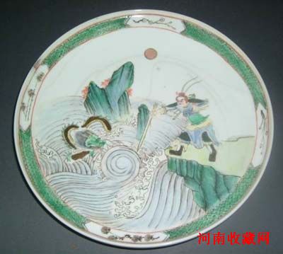 取材于唐朝房玄龄撰写的《晋唐窑卷五十八窑列传第二十八》“周处”一章。此盘选择了周处与长桥下蛟龙激烈搏斗的场面。画面中一轮红日挂在天空,长桥下一块巨大的礁石矗立在湍急的河水之中,汹涌澎湃的波涛撞击着礁石,溅起了朵朵浪花。一条青面獠牙的恶兽伸出攫人的利爪在水中时隐时现,随时准备攻击岸边的周处。浓眉赤发怒目圆睁的周处,站在一块巨石之上身批甲胄,弓腰蹬腿右手挥舞利剑直指漩涡中凶猛的蛟龙。此盘运用了娴熟的技艺,把蛟龙的凶残和周处的勇猛刻画得极为生动形象。五彩斑斓的色彩体现了康熙五彩瓷器的特色,绿色的巨石上点缀几朵红色花草,呈现出鲜艳强烈的色彩效果。