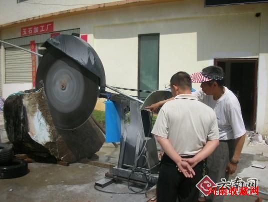 4日下午,一台直径1.6米的切割机开始对5吨多重的巨石翡翠毛料实施切割“手术”(本报6日M08版曾做报道),之后,未知的结果引起众多商家和玉石爱好者们的极大关注。据了解,这块毛料是李枝荣3年前花了近千万元从缅甸购买的,此前有商家出价3000万元,但他没有出手。