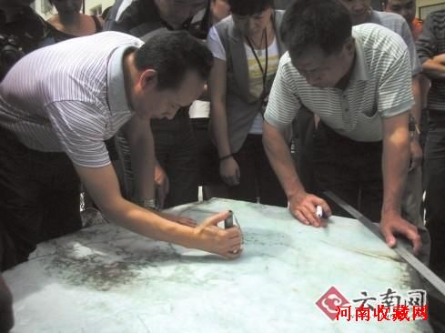 鞭炮声炸落,李枝荣和公司另一个副董事长以及玉石界同行,围拢在剖开的切块前,仔细认真评鉴,并拿来尺子细心丈量划线、标记。