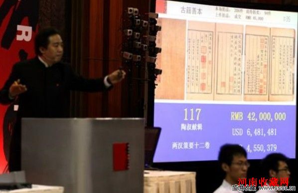 5月22日,在中国嘉德2011春季拍卖会古籍善本专场中,元抄本《两汉策要十二卷》16册以900万元起拍,经过近70次激烈叫价,最终以4830万元人民币创出中国古籍拍卖世界纪录。