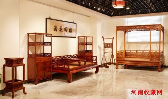 本次文博会,伍氏兴隆展厅在第九号工艺美术展馆显得别具一格,古典建筑的风格,青砖白瓦的外墙装饰,以及门口两棵青翠欲滴的盆景树临风迎客,瞬间“秒杀”了宾客的眼球。展馆中,伍炳亮按照明式海南黄花梨系列、越南黄花梨系列和清式宫廷紫檀系列、老红酸枝系列将精品家具进行了展示,整个展厅显得整齐划一而又错落有致。