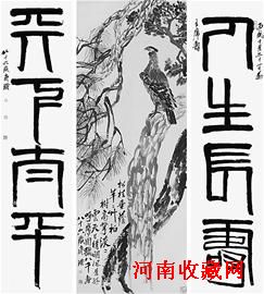《松柏高立图·篆书四言联》为齐白石绘画及书法尺寸最大的一幅,画作纵266厘米,横100厘米,所匹配的篆书“人生长寿,天下太平”对联,单幅纵264.5厘米,横65.8厘米。画面气势宏伟,有松柏围英之喻。据嘉德介绍,白石老人自题此画作于丙戌年(1946年),“八十六岁齐璜”。画家所要表达的是对国家民族和平发展的美好祈望。2005年由美国旧金山私人释出后流入大陆。