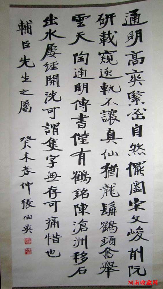 萧一山所著《清代通史》就是孙中山、蔡元培和张伯英题署书名的。张伯英以行楷最有成就,亦擅篆隶。楷书结构紧敛而不拘谨,字体规整端庄、方圆兼备,既宽博雄放又紧凑严密,内多劲力。行楷朴实秀逸,古拙自然。张伯英用笔万毫齐力,圆满峻发,点画所到之处,极具朝揖相让之法。笔笔中实,字字气满,凝重含蓄,不泥于古,不媚于今,富于创新精神。用笔能任情挥洒,意度自为高远。张伯英极擅书写碑志,数百字大楷不用划线,从头到尾一气呵成,而分行布白、范围大小莫不恰到好处。 张伯英一生酷爱书法,早年从颜体入手,再学魏碑,卓然成家。明清以来徐州书法界人才辈出,形成彭城书派。彭城书派素来以北碑为宗,方劲古拙,蔚为风尚。张伯英秉承彭城书派传统,又植根汉魂而化以苏、黄,笔力凝重,楷书结构紧敛而不拘谨,字体规整端正而有洒脱之致,用笔方圆兼备,宽博雄放,紧凑严密。行书朴质秀逸,古拙自然,有夺人之效应。行草书亦能见其刚劲风骨。深厚功力出之于传统,行之于独创。遂以彭城书体名于当世,为彭城书派接武前贤之盟主。后又受康有为、包世臣等金石学派的影响,精习《张玄墓志》等北碑,骨格自然超凡拔群,“笔阵曾教淮海惊”。 其又精于碑帖评鉴,曾仿《四库提要》体例著有《法帖提要》七卷。其中列举了自宋至清帖刻512 种,详细分析论及了各家书法流派的优点与不足,为我国书法碑帖学界权威名著。自谓“平生无他技,惟承家训,辨书帖真伪无所失。”性耿介,重操守,对弘扬祖国传统文化贡献颇多,为时人所敬重。 一时,从穷乡僻壤到通都大邑,伯英书法矫然突出,引人注目,为世人称赞。清末民初,张伯英与赵声伯并称南北二家,又与傅增湘、华世奎、郑孝胥并称书法四大家。至今,北京前门大栅栏“亿兆棉织百货店”、琉璃厂西大街“观复斋”、东大街“墨缘阁”的牌匾,皆为伯英所书,依然高悬门前。 先生一生正直,颇有节行。他不屑于和封建军阀同流合污,抛弃官位,卖字卖文为生。北平沦陷后,他隐居不出。并屡次致书当时任徐州伪市长的叔父张云生莫做伪事。先生与清末遗老康有为、梁启超、罗振玉、郑孝胥等过从甚密,但却力主共和,反对复辟。他晚年怀着改良主义的理想而不得伸展。此外,他还与于右任先生、张学良将军及齐白石等私交深厚。张伯英尤为奖掖后学,书画界人不少都曾受其教益。