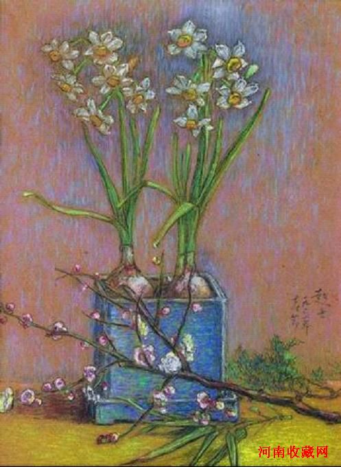 李超士的《西瓜》刚刚在嘉德以448万创下画家成交纪录,此番匡时新推写生专场上拍的李超士《岁朝四友》(46×33cm,纸本色粉,估价12万至15万元)创作于1962年春节,与《西瓜》出版于同一本画集,更见文人情趣。蓝釉方罐中栽着两株盛开的水仙,桌面是大胆的柠檬黄,蓬松的松枝和粉嘟嘟的梅花刻画得尤为细腻精彩。李超士不愧有“中国的德加”之称,用色粉材料画出了地道的中国精神,文人气质。