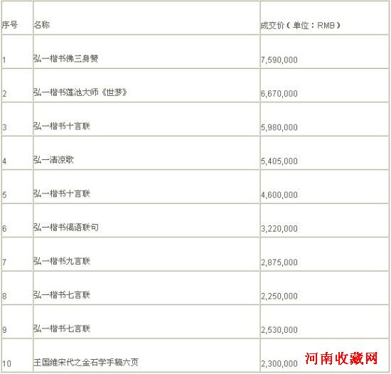 辛亥百年名人书法专场成交前十名