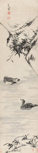 朱耷(1642-1717),籍贯南昌,明朝宁王朱权的后代。明亡后,削发为僧。号八大山人。八大山人构图简练而又富有情趣,山岩如倾似危,丛竹倒垂,生机盎然,聊聊数笔,将生活在乱世间的景象神形毕现地显露出来。一对鸳鸯在岩下对视,悠然自在。它们对周遭已无心过问,一副与世无涉,孤傲自守的神态。