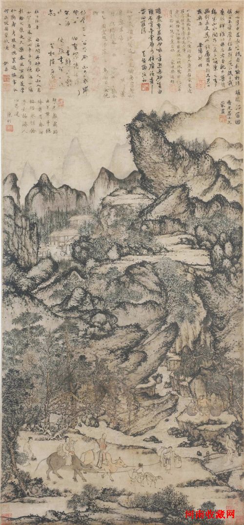 这幅作品画的是东晋葛洪移居罗浮山炼丹的故事。画上有与王蒙同时或稍后的七位大学者、大画家或大诗人如王冕的老师韩性、“元四家”倪瓒、陶复初、陈则等人的题诗。