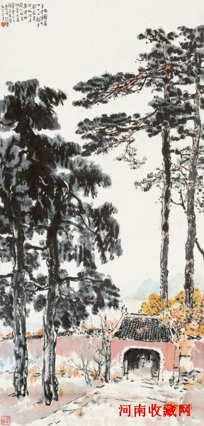《峨眉古寺》作於1936年3月,虽然山水画在徐悲鸿的作品中所占比例最少,但徐悲鸿喜游历,每遇奇美之景,必有山水风景画创作。徐悲鸿在山水画上主张“师法造化”,到大自然中描写实景,反对清初“四王”以来片面追求笔墨意趣的“样式山水”。此图便是写生山水之作,画面以水墨速写的方式营造出山石树木的景致,树干和山石略施勾勒,叶片不拘形状,石面及背景也用淡墨轻松涂抹,然而整个画面却在一种十分严密而精巧的构图之中将峨嵋古寺风光定格在一个永恒的时刻,此种画法及构景法在徐悲鸿的作品中都极为少见。此图构思富於技巧,运用对比和遮掩的手法来表现杉木的参天气势。图中前两棵古杉现出全貌,而後两棵却为古殿围墙所遮挡,隐去古杉根部,扩大了想象的空间,增强了古杉的雄伟气势和前後的对比。