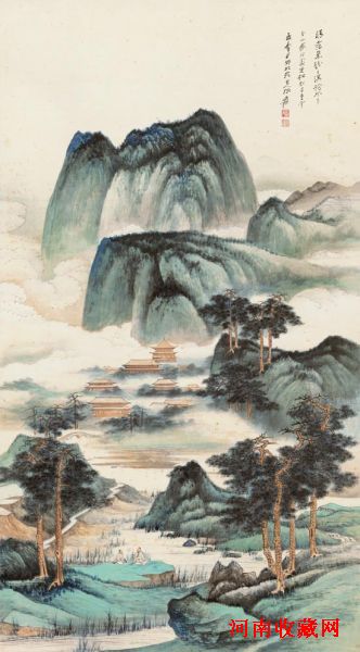 此幅作于1947年,大千的仿古写生山水在此间进入了一个高峰期。此阶段无论是临仿之作,还是自作的青城、峨眉等写景山水,均受董巨派影响很大,此幅作品即为师法董源。画面取五代宋初山水典型的三远式构图,不过在总体景物的布局上亦可见西方风景画中的透视法。远处峰峦叠嶂,山峰形状奇特,气势温和厚重,与荆关派石体坚硬、气势雄强的画风有所不同。中部为山间谷地,殿阁庙宇在雾气的弥漫中依次远去,稀稀落落散布在山坡上。画面下段山溪潺潺,虹桥架设其上,缓坡云树渐叠,水畔嘉木葱茏,小径蜿蜒远引,二位高士临水盘膝而坐,于山水间高谈阔论。整幅意境高妙,既有重重殿宇造成的华丽气象,又流露出一种高士隐居的悠闲逸致。
