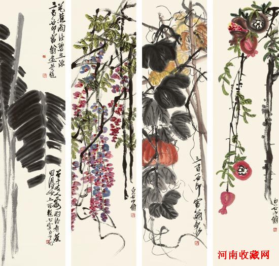此四条屏的花果皆以大写意笔法画出。画中芭蕉全用墨笔写就,构图简洁,用墨浓淡挥洒,一气呵成,是其简约却畅快淋漓效果的最佳演绎,而素净的画面当年最受日本收藏家喜爱。用赭石、藤黄所作的南瓜,阔叶硕果与虬曲有力的藤蔓错落有致,层次分明,笔意饶饶,杂而不乱,婉而成章。以石榴祝“世人多子”是白石老人风俗味的表现,画中石榴用洋红圈点,暗处墨色大量混和,绽开的石榴子尤其饱含生机,石榴和翠叶的鲜艳饱满与枝杆的苍劲形成对比,突出质感与生命力。另一幅紫藤也有异曲同工之妙,花瓣用色纯净浓烈,胭脂红历久弥新,天然、明快之气息扑鼻而来。四幅皆为老人熟悉的题材,虽是生活中最普通、常见的果蔬,但老人赋予它们生动之致和温馨的情味,它们体现了老人在平淡生活中的乐观态度,饱含了浓郁的思乡之情,乃为代表老人在“衰年变法”时期风格的佳作。