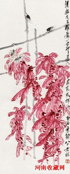 此幅数株雁来红纯以朱砂写出,淡色表现叶片的润泽,重色勾出叶片的筋脉,红而不艳,疏而不密。井字形竹架以淡墨写出,竹节分明,笔势流畅,颇见书法笔意,其横向的两根竹竿向上倾斜,打破垂直的竹竿和雁来红形成的单调感,造成空间分割上的趣味。两只夏蝉一立一卧伏在竹架上,其通体浑黑,翼薄如纱,明透有质感,翼上脉络以极细的笔法勾勒,翼下蝉身清晰可见。两只蝈蝈停在雁来红上,其翠体蓝腹,节支比例准确,鸣虫薄翅,一震一平,触须前探,虫目透光。后肢一屈一伸,动态十足,静观之,则似鸣声入耳。四只工笔草虫的结构均准确生动,妙趣横生。整幅章法巧妙,疏密有致,既有整体上的不拘一格,又有细致入微的描绘,大写意的信笔挥洒与草虫的精细形成鲜明对比,相映成趣。