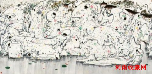 “我作过一幅《狮子林》……画面五分之四以上的面积表现的是石头,亦即点、线、面之抽象构成,是抽象画。我在石群之下引入水与游鱼,石群高处嵌入廊与亭,一目了然,便是园林了。”